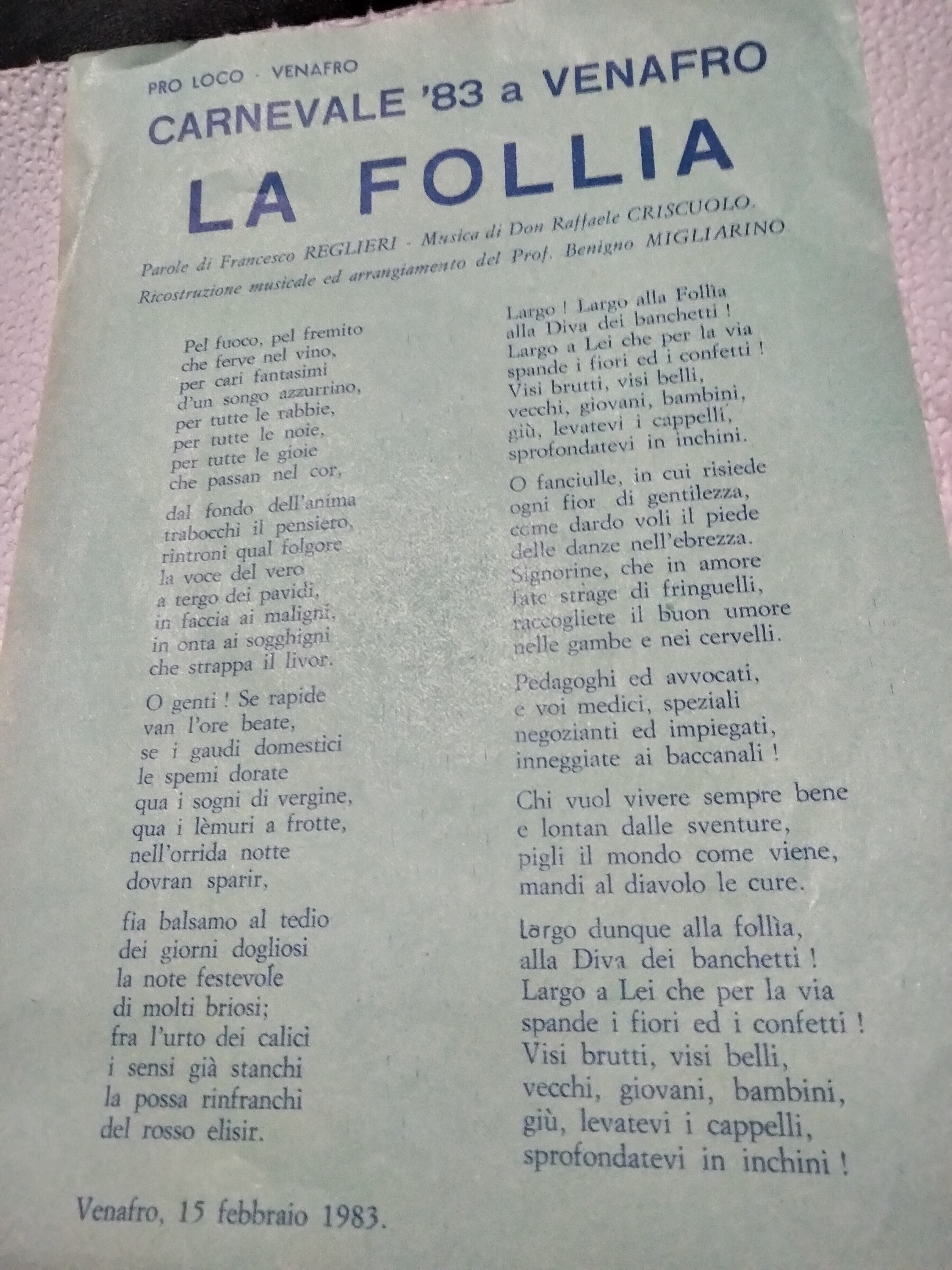 Si dirà: era questo il bellissimo Carnevale venafrano del passato? Incredibilmente era anche questo, ma non solo per fortuna! Infatti tra gli appuntamenti carnascialeschi cittadini decisamente di tutt’altro tono e tenore, ossia divertenti ed oltremodo coinvolgenti, va citato certamente “La Follia”, recita carnevalesca con decine di interpreti, assolutamente unica, divertente al massimo e presentata l’ultima volta nel lontano 1983 dall’allora Pro Loco di Venafro. Trattavasi di una donna, La Follia appunto, che conquistava cuori, accendeva desideri e faceva folleggiare tanti che la corteggiavano in mille modi per ottenerne grazie e sorrisi! Nell’83, in occasione dell’ultima rappresentazione de “La Follia” (testo di Francesco Reglieri, musica di Don Raffaele Criscuolo e ricostruzione musicale ed arrangiamento del prof. Benigno Migliarino) la particolarissima mascherata girò in lungo e in largo per la città, intrattenendo il pubblico con canti, suoni e danze durante le numerose fermate su piazze e strade principali. E tutti seguivano, si divertivano, cantavano assieme a La Follia, danzando e folleggiando a loro volta!