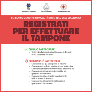 TERMOLI – Al via le prenotazioni online per sottoporsi al tampone rapido gratuito per lo screening di massa sulla popolazione a Termoli. Lo ha fatto sapere l’amministrazione comunale, annunciando che da oggi 2 marzo si potrà effettuare la prenotazione dal sito ufficiale dell’ente comune.termoli.cb.it.