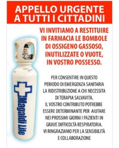 L’invito a tutta la popolazione, è quello di recarsi presso la più vicina farmacia e consegnare le bombole di ossigeno che si hanno in casa e sono vuote o inutilizzate.