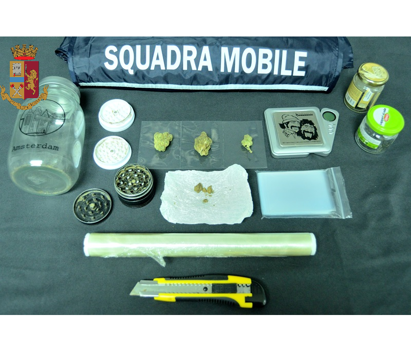 A seguito di una serie di servizi di osservazione, gli Agenti della Squadra Mobile hanno deciso di procedere alla perquisizione domiciliare presso un appartamento del condominio oggetto delle segnalazioni, il cui esito ha confermato i sospetti degli investigatori. Durante tale attività sono stati rinvenuti, infatti, vari grammi di hashish e marijuana oltre a materiale per la pesatura ed il confezionamento in dosi dello stupefacente.