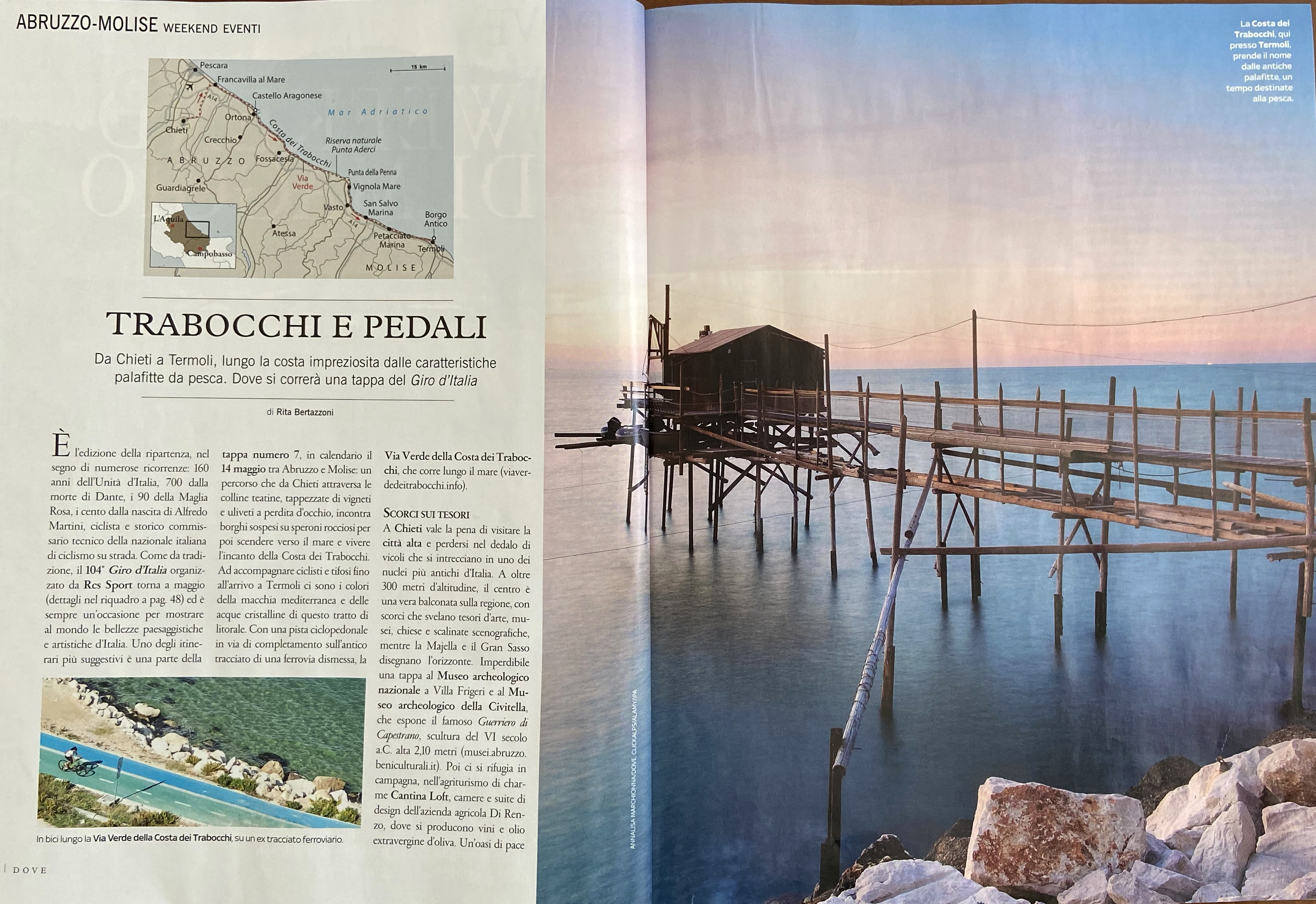 “Dove”, rivista di viaggi del Corriere della Sera e Rcs, nell’articolo “Trabocchi e pedali” a firma di Rita Bertazzoni, concentra la sua attenzione sulle mete della corsa e segnala ristoranti e strutture dove soggiornare al seguito del Giro tra Abruzzo e Molise. In quest’ultima rivista a pagina 26 campeggia una foto iconica del trabucco di Termoli.
