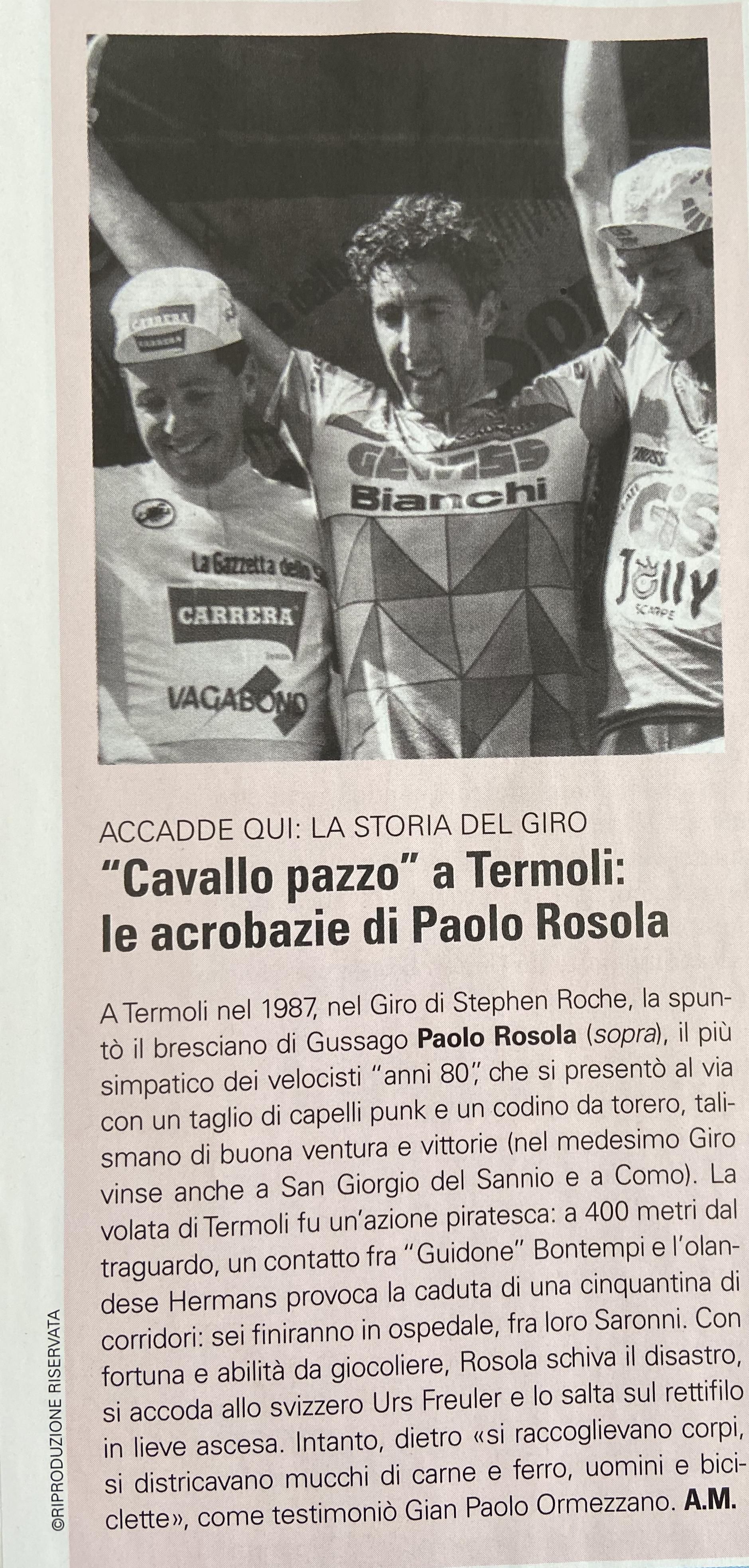 “Bell’Italia”, di Cairo Editore, oltre a fornire un attento itinerario della settima tappa del Giro che culminerà a Termoli il 14 maggio prossimo, con lo speciale “Profumo di Sud” a cura di Roberto Mottadelli e attraverso un ulteriore approfondimento ricorda un aneddoto del Giro d’Italia del 1987 quando, proprio nella città adriatica a quattrocento metri dal traguardo e a causa di un contatto tra “Guidone” Bontempi e l’olandese Hermans, circa 50 corridori rovinarono a terra. Per sei di loro si resero necessarie le medicazioni del caso all’ ospedale San Timoteo. Nello speciale giganteggia la foto del borgo vecchio di Termoli ripreso dalla spiaggia di Sant’Antonio.