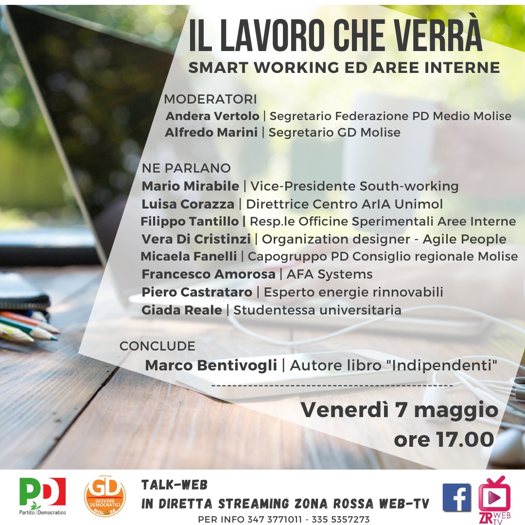 Il primo incontro, dedicato allo smart working, ospite Marco Bentivogli, prenderà il via venerdì 7 maggio alle ore 17.00 in onda sulla pagina Facebook di Zona Rossa Web Tv, è intitolato “Il lavoro che verrà: smart working ed aree interne” e verterà sulle opportunità e sulle dinamiche di tale attività con particolare riferimento al territorio molisano.