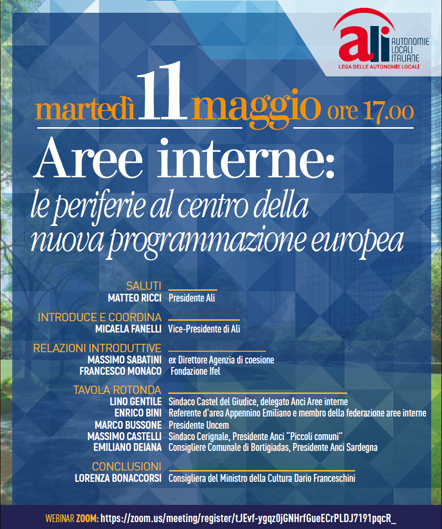 CAMPOBASSO – Il tema delle aree interne e delle periferie nella nuova programmazione europea sarà al centro di un ampio confronto promosso da ALI in programma martedì 11 maggio a partire dalle ore 17:00.