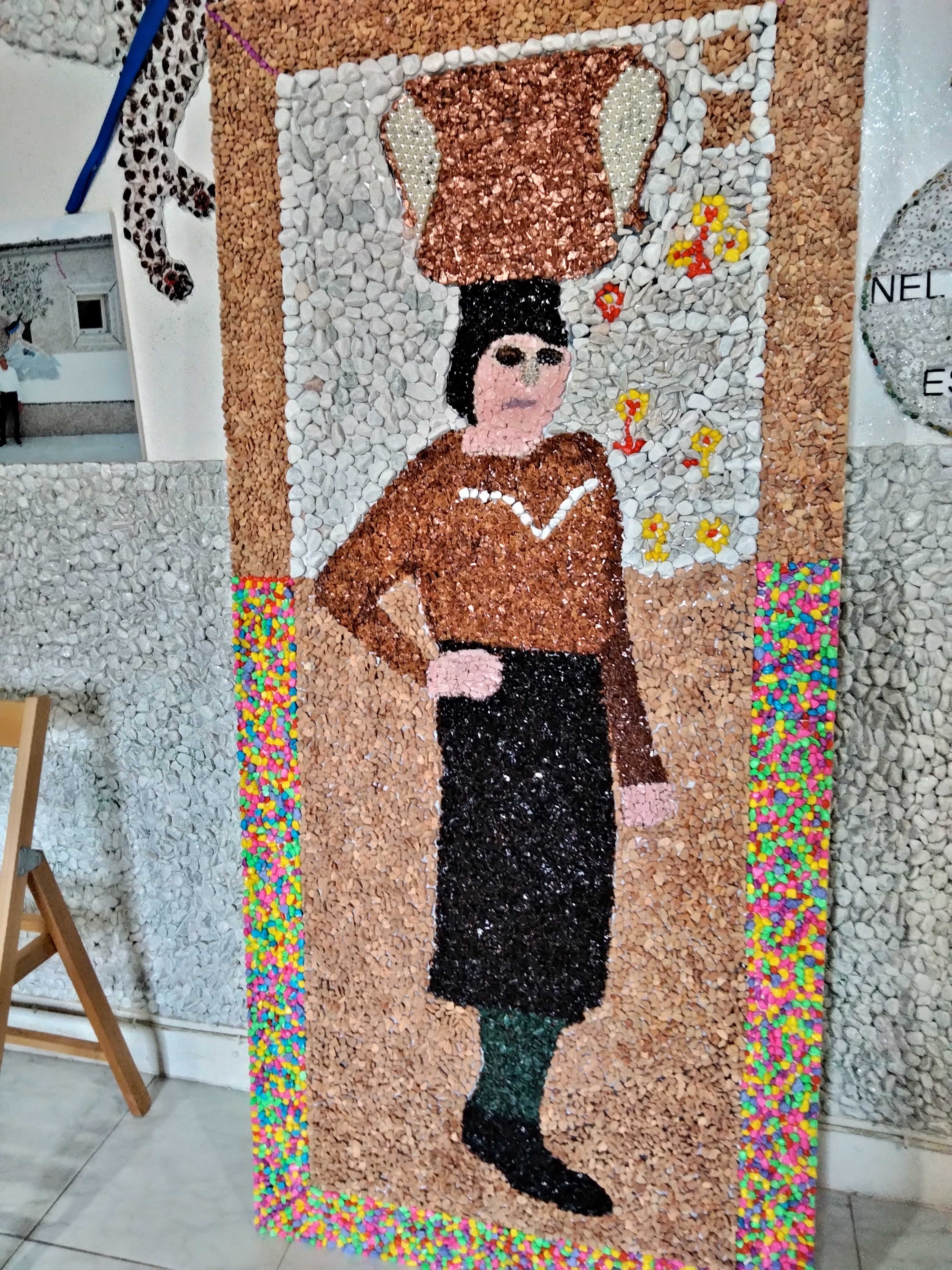 Vi ha pensato infatti Nicandro Senerchia, oggi pensionato dopo essere stato apprezzato lavoratore del settore edile, che ha realizzato un suggestivo quadro che ben volentieri mostra a vicini di casa e a quanti transitano per le Manganelle, il rione venafrano più a nord dell’abitato e che prende il nome dall’antica porta omonima situata in zona, ossia Porta delle Manganelle, storica ed importante quanto si vuole ma che versa in totale abbandono e decadenza. Ebbene il buon Nicandro, munitosi di materiale su cui lavorare e di colla, colori e pietre da attaccare, ha prima disegnato sul pannello la figura della popolana venafrana con la tina in testa e in abiti del tempo andato, dopodiché ha attaccato centinaia di pietre di ogni dimensione e le ha colorate con scrupolosa accortezza per dar vita a popolana, tina, abbigliamento e ambiente circostante. Alla fine ecco venir fuori l’originale mosaico de “La popolana venafrana con la tina”, lavoro quanto mai suggestivo, particolare ed apprezzato da tutti, quale momento indimenticabile della vita delle generazioni trascorse!