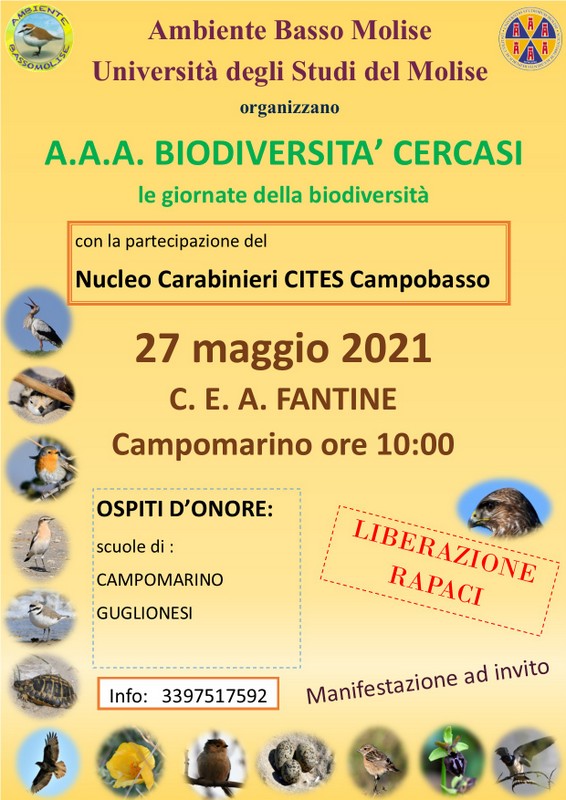 L’evento è realizzato nell’ambito del progetto “A,A,A, Biodiversità cercasi” organizzato da Ambiente Basso Molise con la collaborazione dell’Università degli Studi del Molise e con la qualificata e gradita partecipazione del Nucleo Carabinieri CITES di Campobasso.