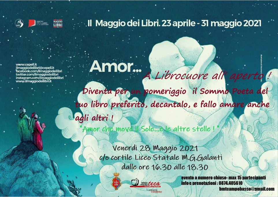 Nell’anno dedicato alle manifestazioni per il 700° anniversario della morte di Dante Alighieri, “Il Maggio Dei Libri” sarà dedicato all’amore, uno dei temi cardine produzione dantesca. L’evento sarà distinto in tre filoni ispirati ad alcuni dei più celebri versi: “Amor… ch’a nullo amato amar perdona“; “Amor… che ne la mente mi ragiona” e “Amor… che move il sole e l’altre stelle“.