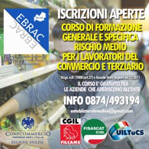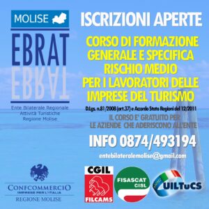 A tal proposito, L’EBRAT (Ente Bilaterale Regionale Attività Turistiche del Molise) ed EBRAC (Ente Bilaterale Regionale Commercio), in occasione della ripartenza delle attività turistiche e commerciali e per sostenere le aziende e i lavoratori del settore, illustreranno agli organi di informazione le iniziative programmate, attraverso una conferenza stampa prevista lunedì 31 maggio alle ore 10,30 presso Cala Sveva a Termoli.