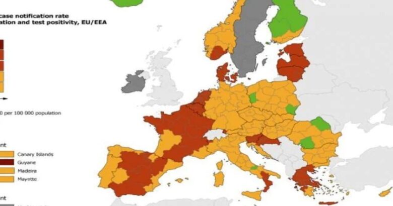 Il resto della Penisola è classificato con colore arancione (meno di 50 casi per 100 mila e tasso di posività pari o superiore al 4%). Questa settimana diventano arancioni, sempre per il sistema di rilevazione europeo, anche la Basilicata, la Toscana, la Puglia e la Campania che erano rosse nella cartina precedente, e che vanno a raggiungere quindi una fascia di rischio più bassa. In rosso invece resta la Calabria, insieme ad ampie porzioni, tra gli altri, della Spagna e della Francia. Nell’intera Europa Occidentale, il Molise è l’unica Regione verde.