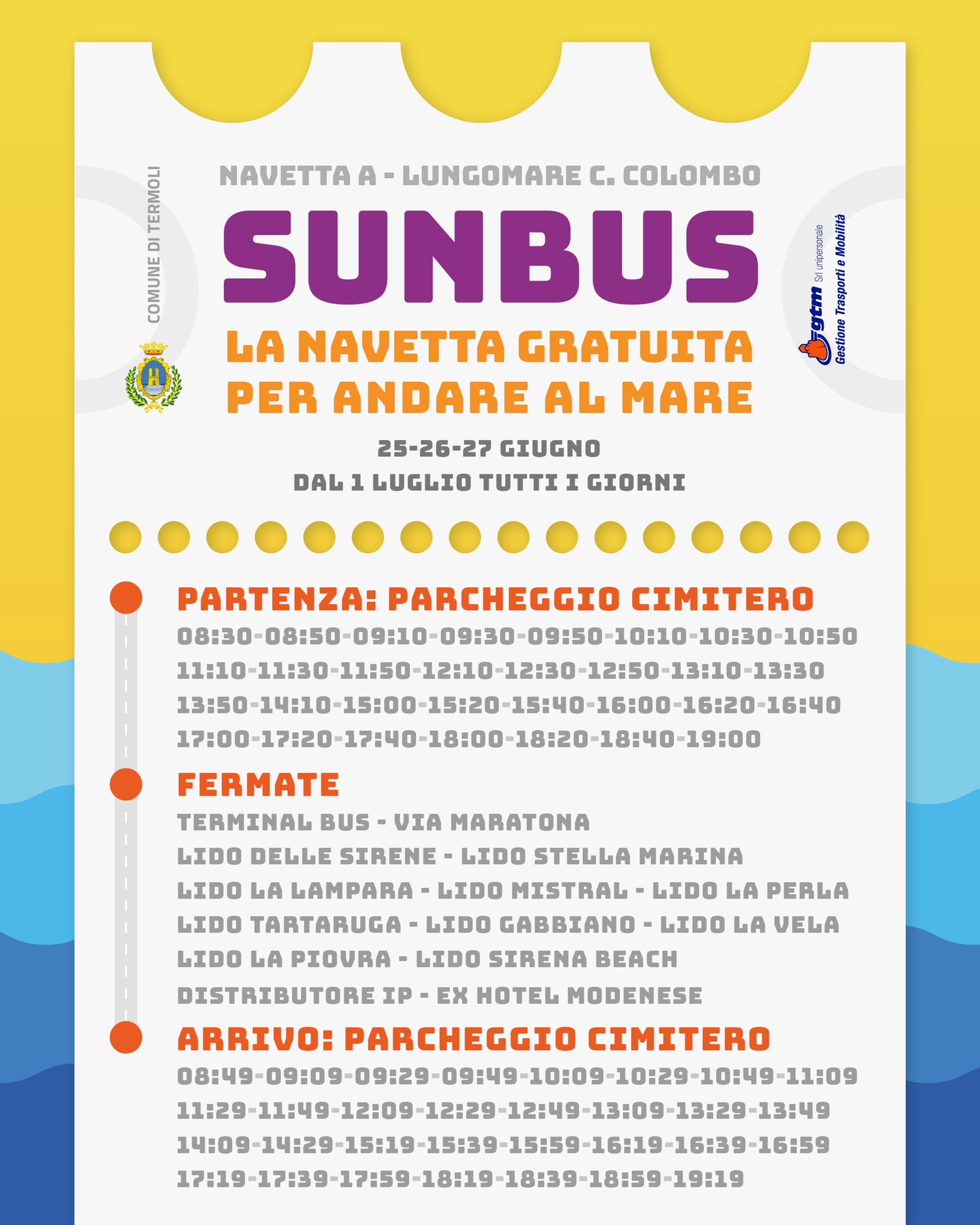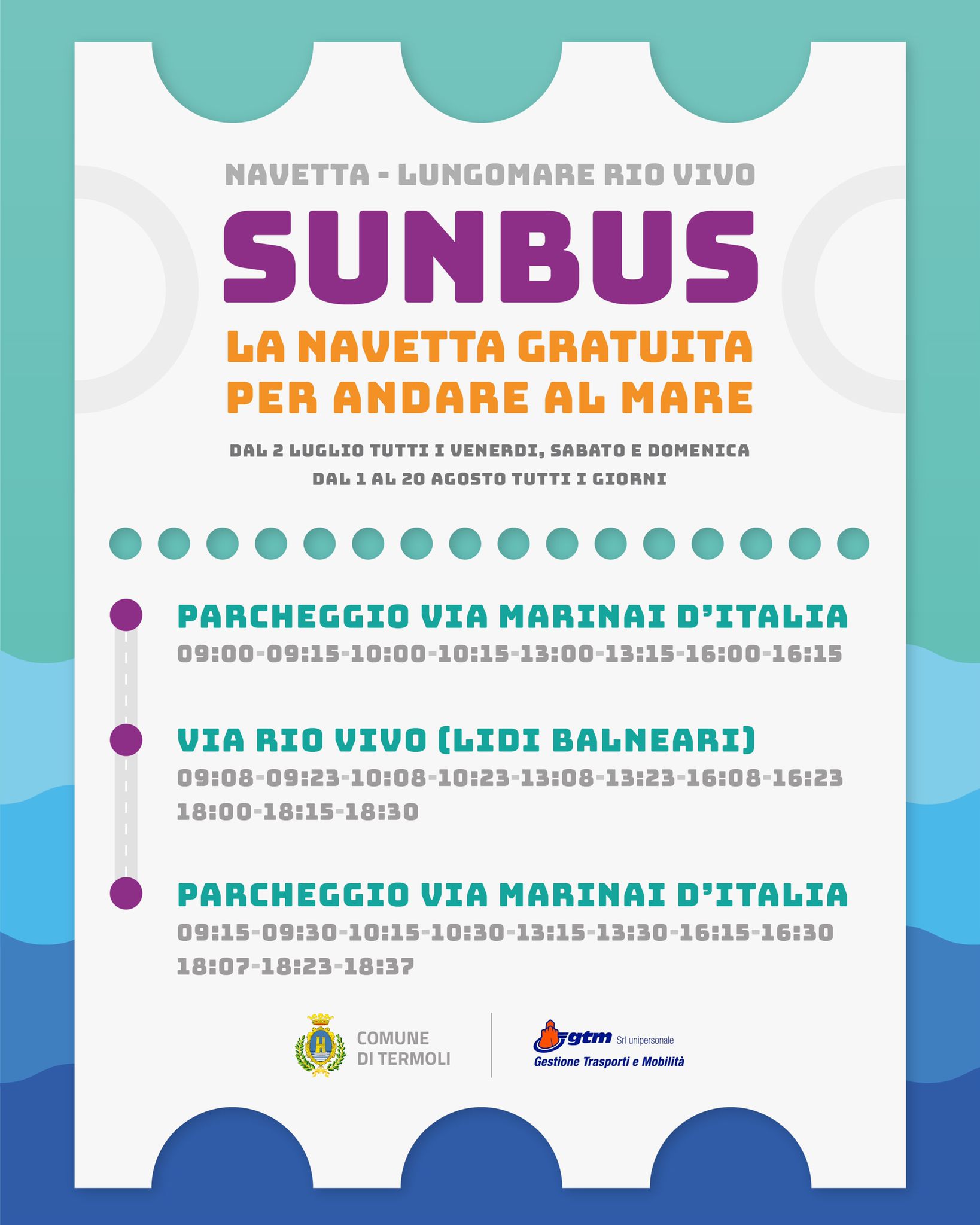 Quest’anno il servizio “Sunbus” consentirà, a coloro che non vogliono o non possono raggiungere la spiaggia con le autovetture, di parcheggiare tranquillamente in due ampie aree di sosta per poi proseguire il tragitto per i due lungomare comodamente a bordo delle navette.