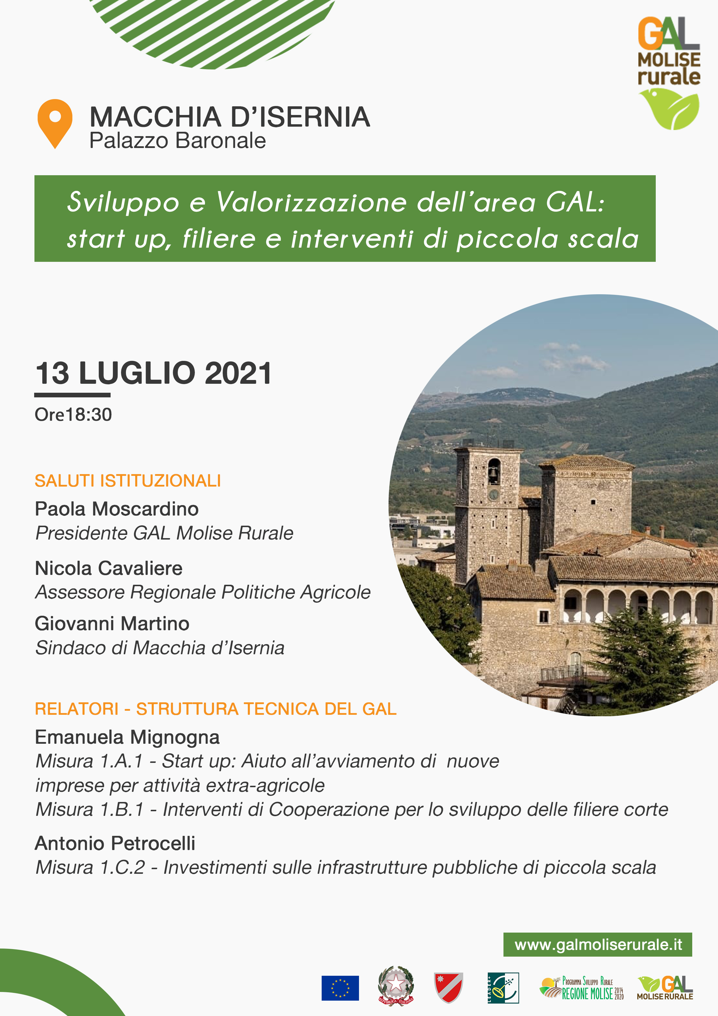 MACCHIA D’ISERNIA – Appuntamento a domani 13 luglio presso il Palazzo Baronale di Macchia d’Isernia per l’evento di chiusura della campagna di promozione promossa dal GAL Molise Rurale, per la diffusione delle opportunità relative agli ultimi avvisi pubblicati, destinati alla creazione di impresa, allo sviluppo di filiere e alla riqualificazione di spazi pubblici.