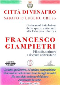 VENAFRO – Una figura, quella di Francesco Giampietri, scrittore, filosofo e docente universitario a Cassino, che il Comune di Venafro intende ricordare con una cerimonia significativa: intitolandogli il vialetto d’ingresso della Palazzina Liberty al rione Ciaraffella.