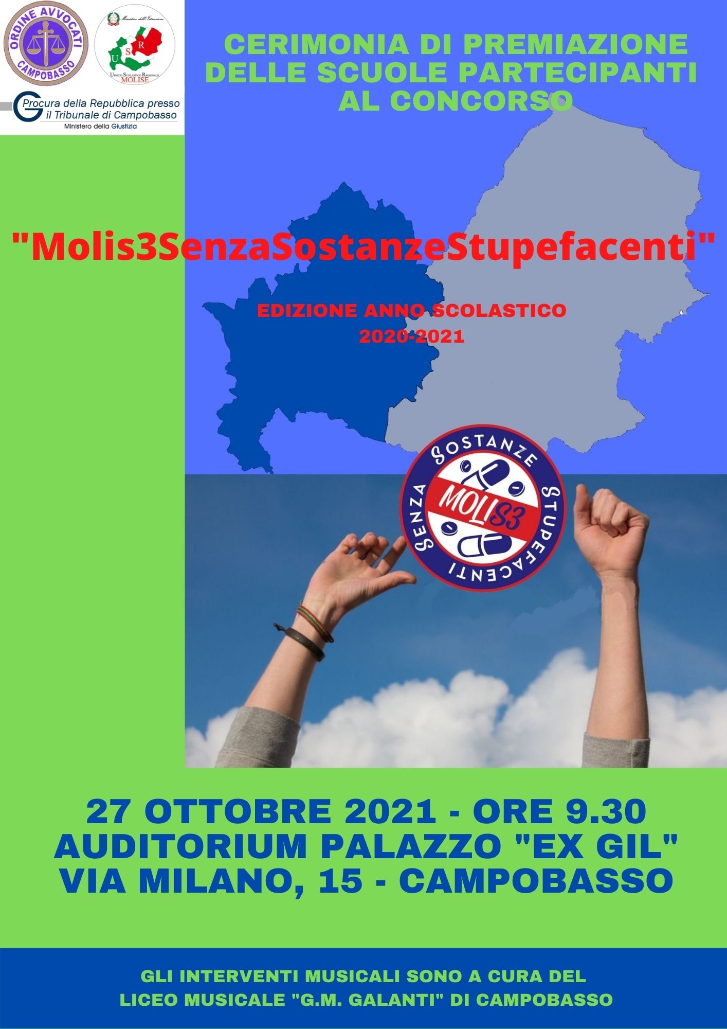 del Concorso “Molis3SenzaSostanzeStupefacenti” promosso dall’Ordine degli Avvocati della provincia di Campobasso, Procura della Repubblica e Ufficio Scolastico Regionale e rivolto agli studenti delle classi III delle scuole secondarie di I grado e agli studenti delle scuole secondarie di II grado della provincia di Campobasso per l’anno scolastico 2020/2021.