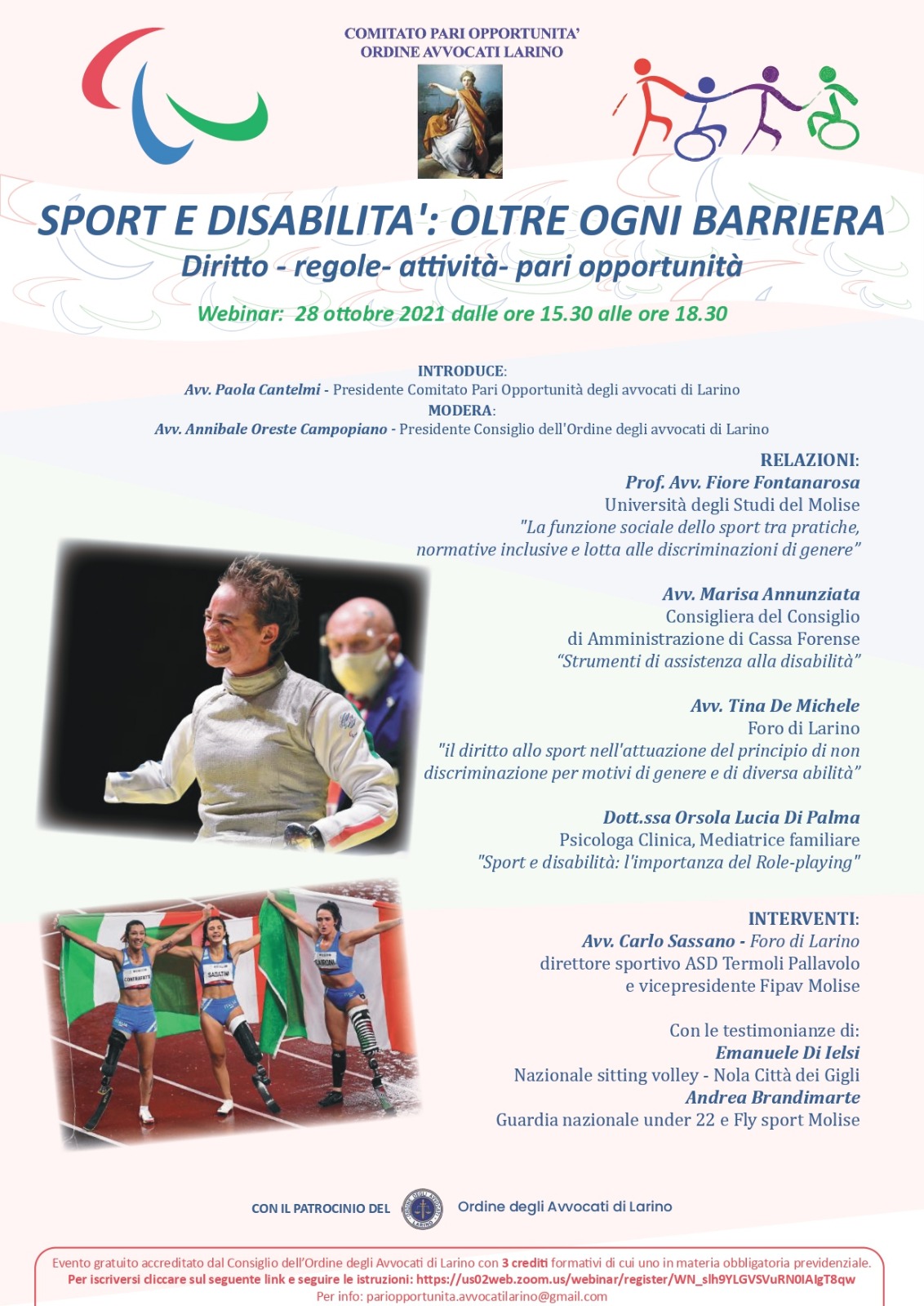 LARINO – Il Comitato Pari Opportunità dell’Ordine degli Avvocati di Larino, presieduto dall’avvocata Paola Cantelmi ha organizzato un incontro a tema su Sport e Disabilità.
