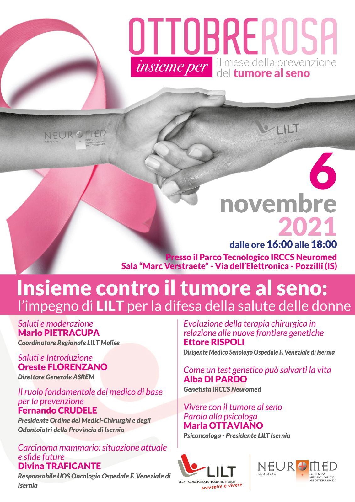 Segue proprio questa strada l’incontro, promosso dall’I.R.C.C.S. Neuromed insieme alla LILT Molise, dal titolo “Insieme contro il tumore al seno: l’impegno di LILT per la difesa della salute delle donne”. L’evento rientra nelle iniziative legate all’”Ottobre in Rosa”, il mese dedicato alla prevenzione del tumore del seno, e si terrà sabato 6 novembre, dalle ore 16.00 alle 18.00 presso il Parco Tecnologico Neuromed di Pozzilli nella sala “Marc Vestraete” in via dell’Elettronica.