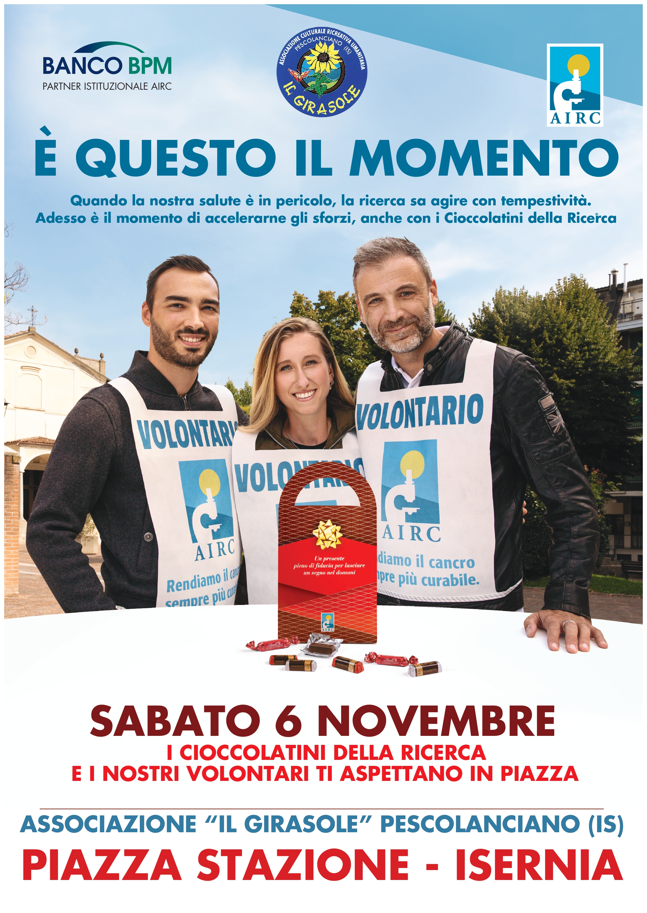 Nell’area antistante alla Stazione ferroviaria l’associazione Il Girasole di Pescolanciano, dalle ore 9 allestirà uno stand per la vendita solidale dei ‘Cioccolatini della ricerca’, aderendo così al progetto dell’AIRC che coinvolge migliaia di volontari e 1.200 piazze in tutta Italia.