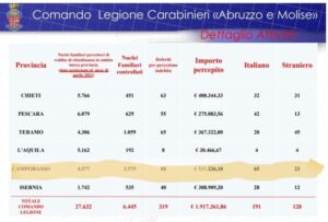 Per quanto attiene ai controlli in provincia di Campobasso è emerso che sono 4.577 i nuclei familiari percettori di reddito di cittadinanza, di questi 3.579 sono stati sottoposti a controllo: sono 88 i nuclei familiari denunciati per indebita percezione di cui 65 di nazionalità italiana e 23 straniera. Nel caso specifico, l’importo percepito indebitamente dai soggetti su indicati, ammonta a 535.236 euro.