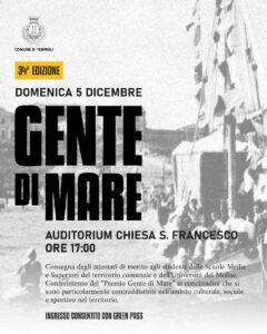 L’amministrazione comunale informa che domenica 5 dicembre alle ore 17, presso l’Auditorium della Chiesa di San Francesco, si terrà la premiazione della 34esima edizione del premio “Gente di Mare”