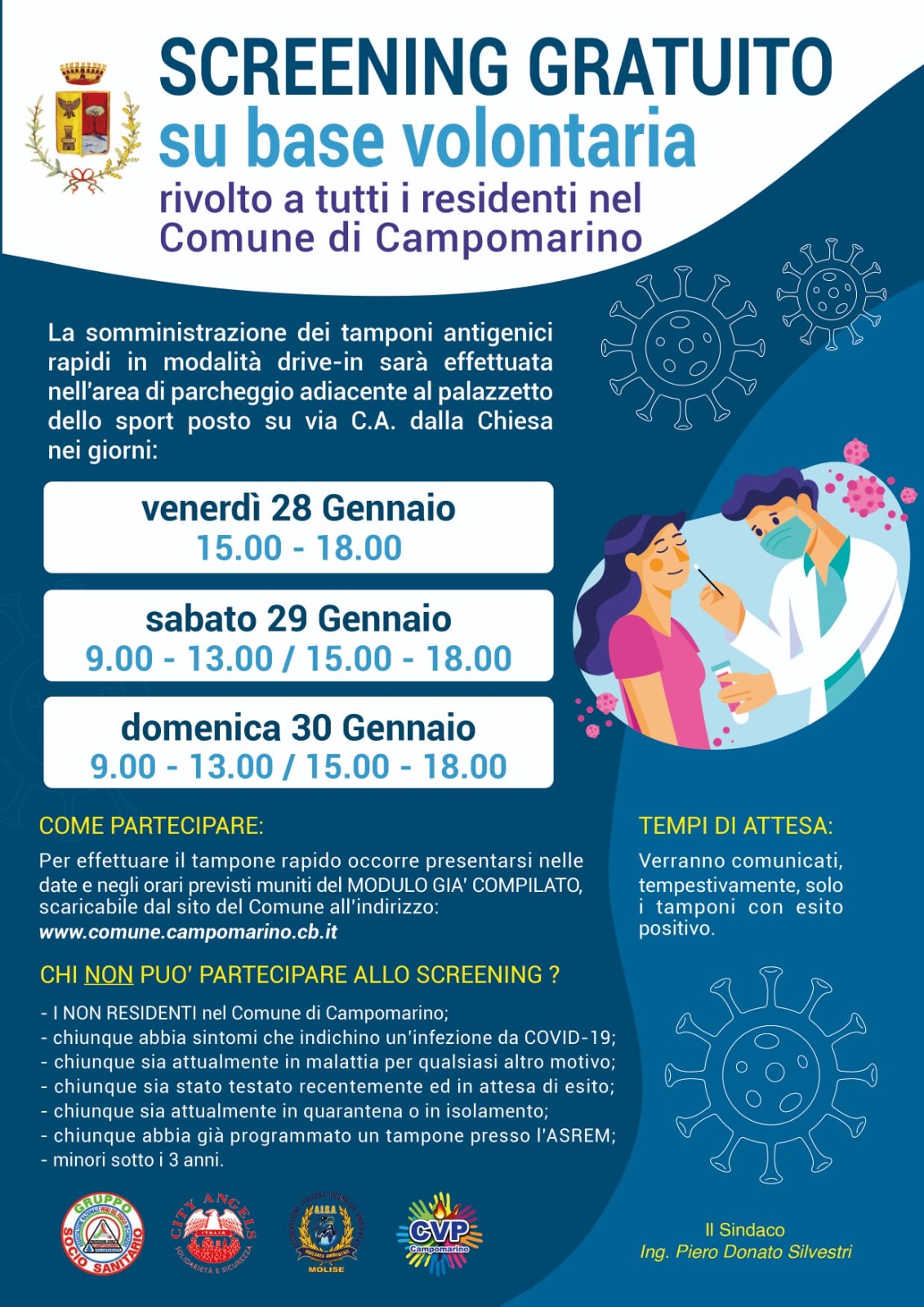 L’amministrazione Comunale, a causa della grave situazione dovuta all’emergenza sanitaria, della pandemia in corso e dell’accertata evoluzione epidemiologica con innalzamento della curva dei contagi, ha inteso promuovere uno screening di massa su base volontaria e gratuita in favore dei cittadini residenti nel comune di Campomarino.