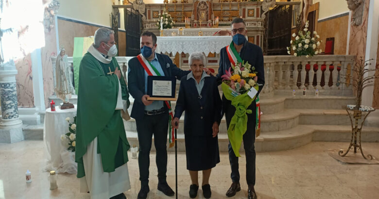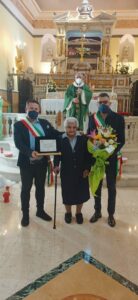 Dopo la Santa messa, celebrata nella Chiesa di San Giacomo Maggiore di Roccamandolfi e la foto di rito, i Sindaci hanno consegnato in omaggio alla dolce nonnina la targa ricordo e un profumato e vivace bouquet.