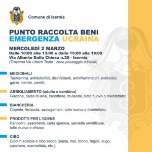 Nella giornata di domani, mercoledì 2 marzo, dalle ore 10 alle 13 e dalle 15 alle 19, sarà possibile donare beni di prima necessità, destinati alla popolazione ucraina, presso un punto di raccolta allestito – su coordinamento del Comune – in via Carlo Alberto Dalla Chiesa n. 30, a Isernia (traversa Via Libero Testa, zona passaggio a livello).