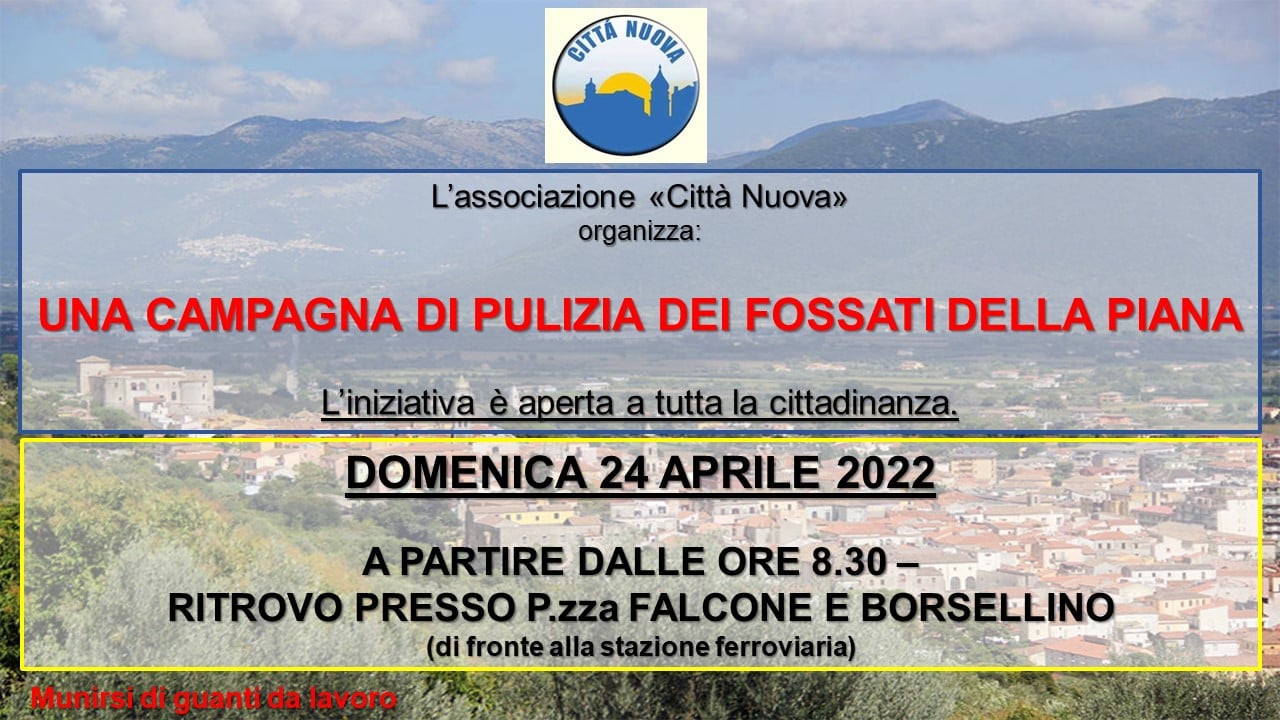 VENAFRO – L’associazione “Città Nuova” organizza per domenica 24 aprile 2022 una campagna di pulizia dei fossati della Piana di Venafro.