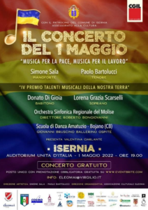 Merito anche della Cgil Molise che per il tramite del suo segretario Paolo De Socio, ha voluto sposare un evento di alta caratura artistica nel quale si esibiranno l’Orchestra Sinfonica Regionale del Molise condotta dal M° Roberto Bongiovanni, direttore di grande qualità ed esperienza, oltre a un cast di indubbio valore come i due “Premi Talenti Musicali della Nostra Terra IV edizione” ovvero il baritono molisano Donato Di Gioia, premio alla Carriera, e il soprano isernino Lorena Grazia Scarselli, premio artista emergente.