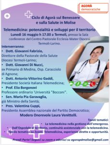 CAMPOBASSO – Le Agorà del Molise arrivano a Termoli. Lunedì 16 maggio alle ore 17.00 nella Sala conferenze del Centro Pastorale Ecclesia Mater Diocesi Termoli – Larino si terrà l’Agorà democratica intitolata “Telemedicina: potenzialità e sviluppi per il territorio”.