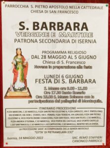ISERNIA – Lunedì prossimo, 6 giugno, il capoluogo pentro festeggerà santa Barbara, patrona secondaria della città.