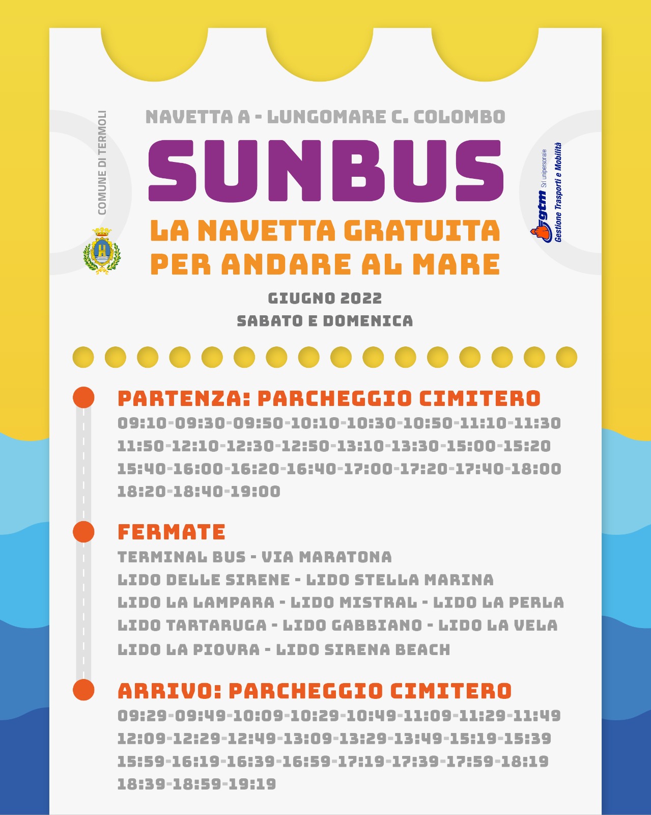 Di seguito la locandina con tutti gli orari e tutte le fermate. Dal prossimo mese di luglio, invece, il servizio navetta “Sun Bus” sarà a disposizione tutti i giorni per entrambi i litorali.