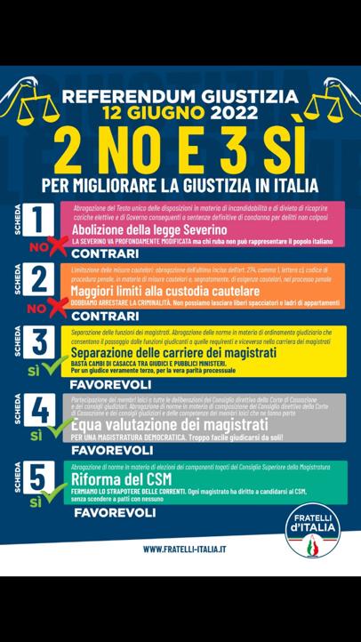 In pratica FdI si dice contrario ai primi due referendum e propone il NO al primo quesito, sostenendo che la legge Severino vada modificata e chi ruba non può rappresentare il popolo italiano. Analogo NO di FdI e quindi contrarietà anche per il secondo quesito “per arrestare la criminalità – fa sapere il partito della Meloni- e perché non si possono lasciare liberi spacciatori e ladri di appartamenti”. Dal terzo quesito e sino al quinto conclusivo, il partito di destra propende invece per il Si, cioè è favorevole, e spiega: “Occorre separare le carriere dei magistrati -si sottolinea sul terzo quesito-  e basta cambi di casacca tra giudici e pubblici ministeri”. SI anche all’equa valutazione dei magistrati, “per una magistratura democratica -puntualizza FdI- perché è troppo facile giudicarsi da soli”. La chiusura con la riforma del CSM ed ancora parere favorevole della formazione di destra. “Fermiamo lo strapotere delle correnti -si ritiene in FdI- ogni magistrato ha diritto a candidarsi al CSM, senza scendere a patti con nessuno”.