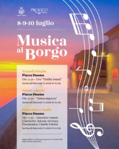 Riflettori accesi dall’8 al 10 luglio, nel prossimo week end, per tre serate, tutti coloro che si troveranno al borgo vecchio potranno assistere a tre concerti musicali che si terranno in Piazza Duomo.