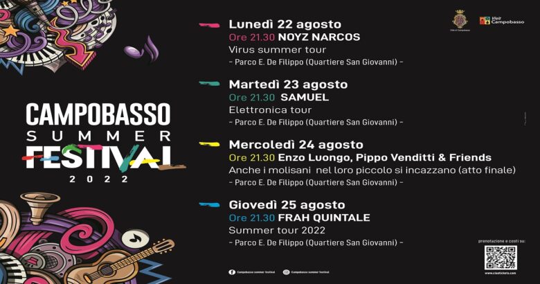 Oltre al concerto di Noyz Narcos e a quello già sold out di Frah Quintale del 25 agosto, le altre serate del Campobasso Summer Festival avranno come protagonista, il 23 agosto, Samuel che porterà al Parco E. De Filippo la scaletta dei brani del suo Elettronica Tour (costo del biglietto 5 euro comprensivo dei diritti di prevendita) e, il 24 agosto, Pippo Venditti, Enzo Luongo & Friends con “Anche i molisani nel loro piccolo si incazzano. Atto finale” (costo del biglietto 5 euro comprensivo dei diritti di prevendita).