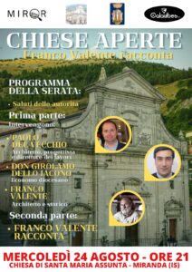 campanile, la parrocchia, in collaborazione con i giovani dell’associazione “Miror” e con l’amministrazione comunale, ha organizzato un evento culturale intitolato “Chiese Aperte” che si svolgerà MERCOLEDI 24 AGOSTO, alle ore 21,00 sul sagrato della chiesa a Miranda a cui parteciperanno alcune personalità che illustreranno i lavori svolti, le caratteristiche storiche e architettoniche della nostra e le altre bellezze del comune molisano.
