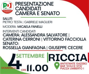 RICCIA – I candidati alle Politiche del 25 settembre del Pd saranno domenica prossima in piazza a Riccia dalle ore 11,00 per incontrare i cittadini del posto.