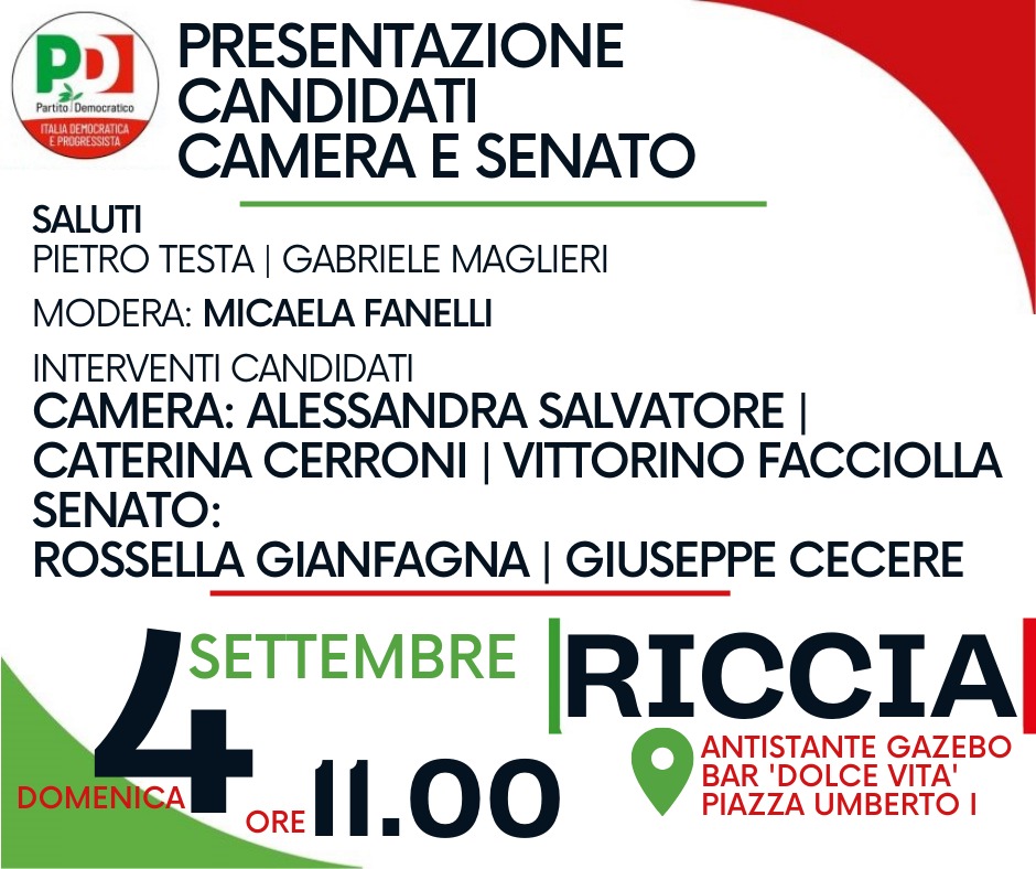 Dopo i saluti del Sindaco Pietro Testa e del Segretario del Circolo PD di Riccia Gabriele Maglieri, moderati dal Capogruppo PD in Consiglio regionale Micaela Fanelli, sono attesi gli interventi dei candidati PD alla Camera: Alessandra Salvatore, Caterina Cerroni, Vittorino Facciolla e di quelli al Senato Rossella Gianfagna e Giuseppe Cecere, che si confronteranno con la popolazione sui problemi del Molise e sulle proposte messe in campo dal Partito Democratico e dal centrosinistra.