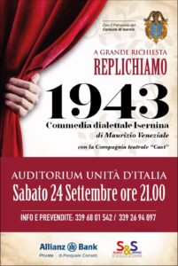 A grande richiesta sabato 24 settembre alle ore 21 torna in scena presso l’auditorium ‘Unità d’Italia’, per un’unica e imperdibile replica, la  Compagnia Cast con la commedia dialettale isernina ‘1943’, scritta da Maurizio Veneziale, con la regia di Salvatore Mincione Guarino. Le scenografie sono curate da Angelo Montella e Paolo Ruberto. Lo spettacolo vede la partecipazione di Angelica Fino e Salvatore Geremia della Time to Dance Academy e l’alto patrocinio del Comune di Isernia, in collaborazione con l’Assessorato alla Cultura.