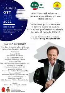 “Per ringraziare le lavoratrici e i lavoratori presenti abbiamo scelto di regalargli una bella serata con un testimonial d’eccellenza il Maestro Roby FACCHINETTI della storica band italiana dei Pooh, icona storica della musica italiana che tanto si è speso nei momenti più bui del Covid 19” – continua il Responsabile del Coordinamento CISL FP Molise Mario Della Ventura. Spetterà a lui il compito di premiare le tante professioni sanitarie molisane che si sono distinte durante la pandemia, e chiudere l’evento con la sua amata musica.