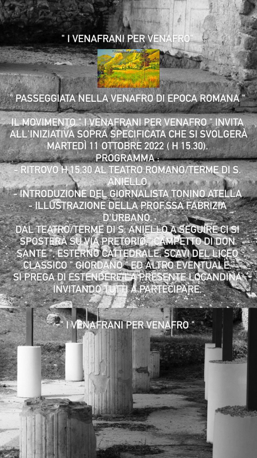 VENAFRO – Martedì 11 ottobre, a partire dalle 15.30 patirà dal teatro romano una passeggiata tra la storia romana della città.