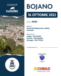 “Dopo il successo raggiunto il 2 ottobre scorso, in occasione della data Nazionale di Raccolta organizzata dall’Associazione Plastic Free, con ben 6 eventi qui in Molise e oltre 240 eventi di raccolta in tutta Italia, il prossimo 16 ottobre si torna in campo con un CleanUp a Bojano in  collaborazione con Conad.