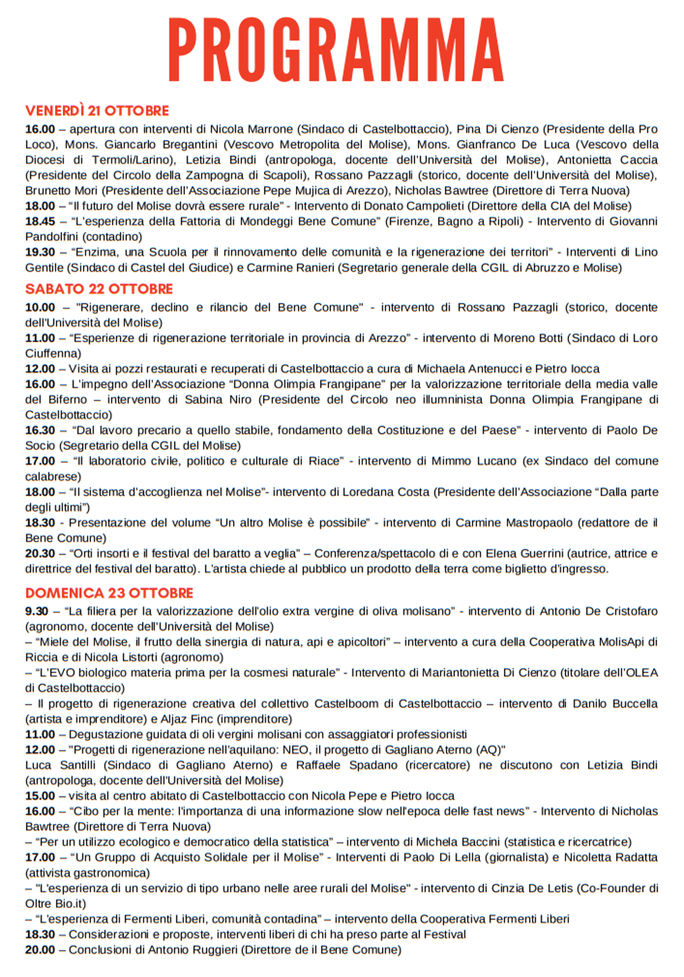 CASTELBOTTACCIO – Il Festival del Bene Comune avrà luogo nei giorni 21, 22 e 23 ottobre.