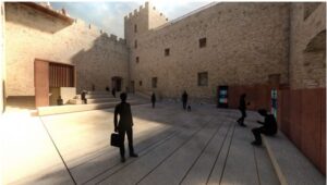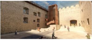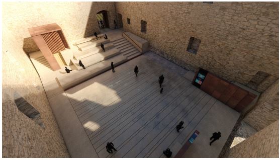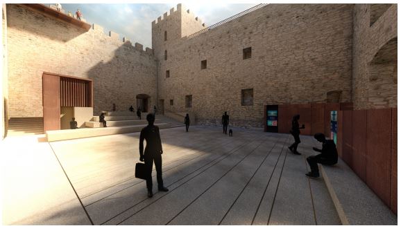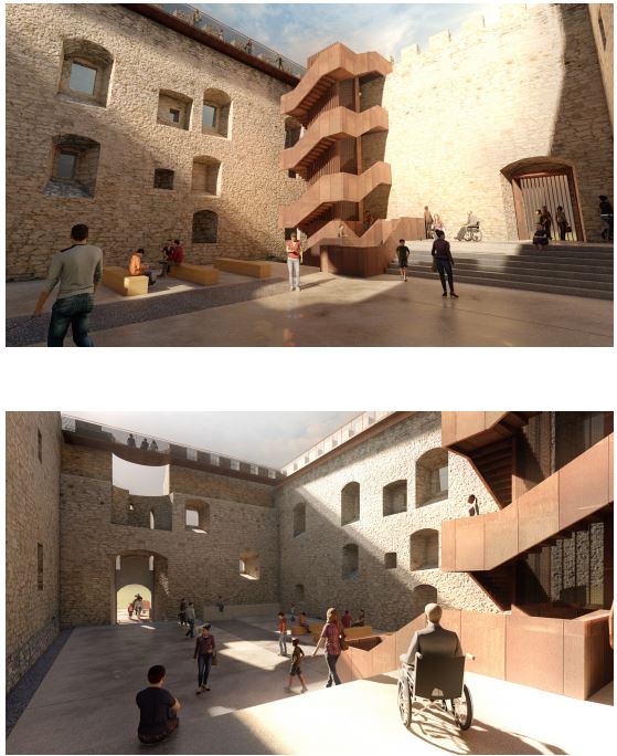 Ad oggi si è partiti così con i lavori per le opere individuate in questo primo lotto. Per rendere accessibili a tutti gli spazi recuperati e le nuove strutture che verranno realizzate, il progetto generale prevede l’installazione, seppur in successivi lotti di intervento, di due impianti ascensore; il primo che collegherà il nuovo piano di pavimentazione della corte con le sale sottostanti, il secondo che consentirà di “sbarcare” sul terrazzo panoramico dal vestibolo del sacrario ripercorrendo in verticale il vano della torre del castello.