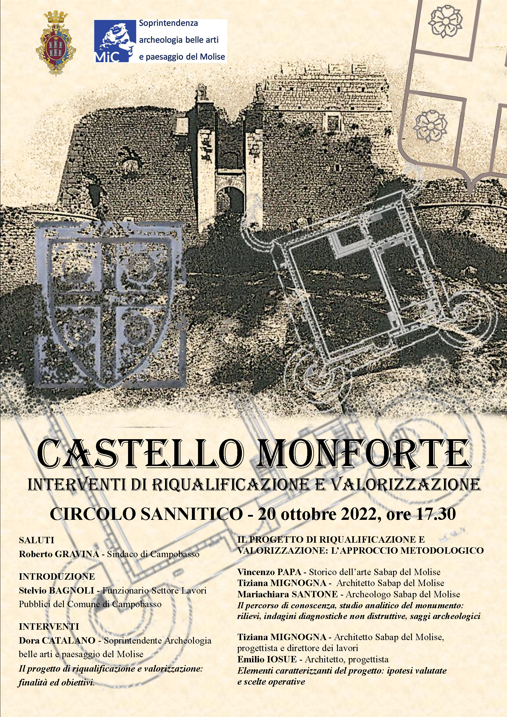 Si terrà oggi, giovedì 20 ottobre, alle ore 17.30, presso la sala del Circolo Sannitico di Campobasso dedicata al Maestro Domenico Fratianni, l’incontro aperto alla cittadinanza organizzato dal Comune di Campobasso in collaborazione con la Soprintendenza Archeologia Belle Arti e paesaggio del Molise, dedicato espressamente alla presentazione del progetto di riqualificazione del Castello Monforte.