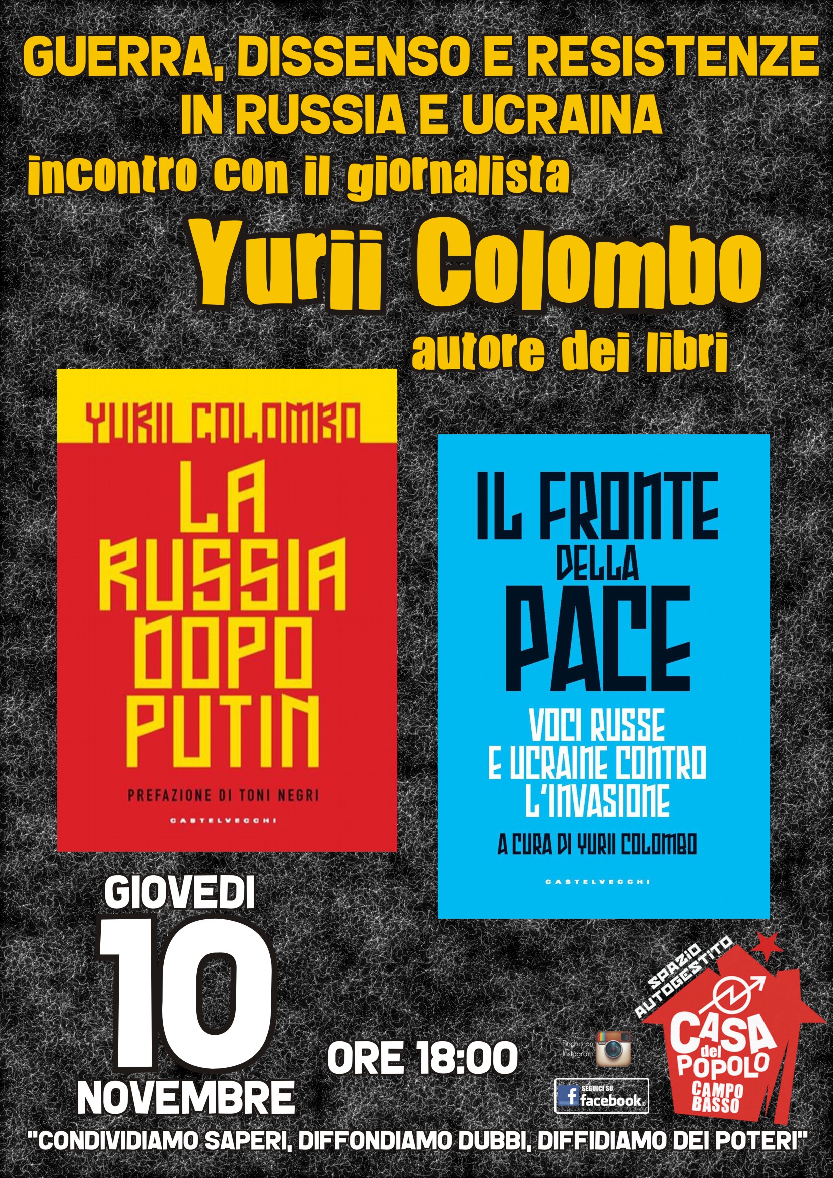 Yurii Colombo, è giornalista freelance residente a Mosca, che ha collaborato con “il manifesto”, Left e Jacobin (Usa) intervistando, tra l’altro personaggi come Michail Gorbaciov, e per altre testate italiane e internazionali. Animatore del canale telegram “matrioska.info“, attualmente collabora con la televisione svizzera italiana. Appassionato di storia e cultura russa e dei paesi ex-sovietici ha scritto “Svoboda. L’Ucraina tra l’espansionismo della Nato e l’egemonismo russo” (Castelvecchi, 2018), “La sfida di Putin. Come cambierà la Russia” (Manifestolibri, 2018). Dallo scoppio del conflitto in Ucraina ha scritto “Il fronte della Pace. Voci russe e ucraine contro l’invasione” e “La Russia dopo Putin” editi da Castelvecchi.