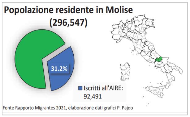 Il Molise ancora una volta registra un primato che fa male al Molise! È al primo posto in termini percentuali seguito dalla Basilicata e dalla Calabria, con oltre il 31%, dei residenti all’estero,cioè iscritti all’Aire, (l’anagrafe dei cittadini italiani all’estero), centinaia in più rispetto allo scorso anno. (92.491 su 296.547, pari 31, 2% contro una media nazionale del 9,5% – Rapporto Migrantes 2021)