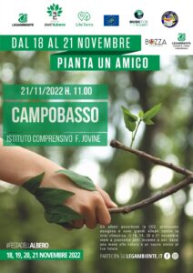 Lunedì 21 novembre 2022, in occasione della giornata nazionale degli alberi, il Circolo Legambiente di Campobasso e l‘istituto F. Jovine di Campobasso pianteranno 30 piante nell’area verde adiacente la scuola in via Friuli Venezia Giulia a Campobasso.