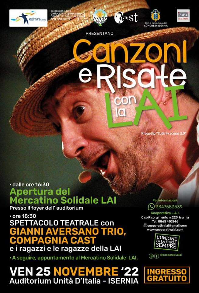 All’evento presenzierà, tra gli altri, Nino Santoro che, nella duplice veste di Presidente di Confcooperative Federsolidarietà Molise e Cooperativa sociale “LAI Lavoro Anch’io”, annuncia anche una seconda iniziativa: questa volta a Isernia. Il giorno successivo, venerdì 25 novembre, l’appuntamento è nell’Auditorium Unità d’Italia dove, alle 18.30, sarà la volta proprio della LAI, che ha organizzato, con il supporto della Compagnia teatrale CAST e con il patrocinio del Comune di Isernia, lo spettacolo “Canzoni e risate con la LAI”.