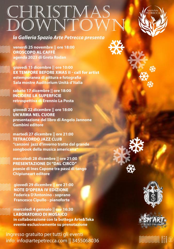 - 17 dicembre ore 18:00 INCIDERE LA SUPERFICIE retrospettiva di Erennio La Posta giovedì 22 dicembre ore 18:00 UN’ARMA NEL CUORE presentazione del libro di Angelo Jannone Gambini editore