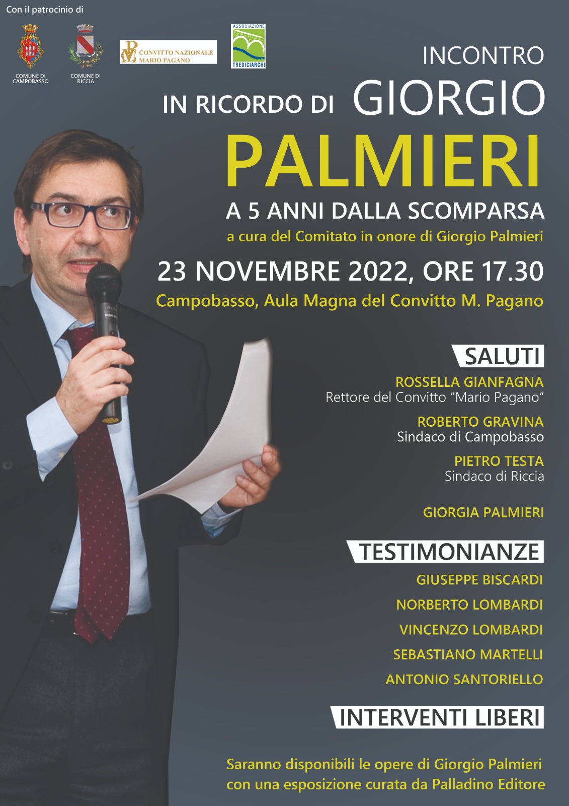 A 5 anni dalla scomparsa di Giorgio Palmieri, è stato costituito un apposito Comitato che, per il prossimo 23 novembre, ha organizzato una manifestazione alla quale prenderanno parte, oltre alla famiglia, alcuni amici di Giorgio e chi vorrà portare la propria testimonianza.