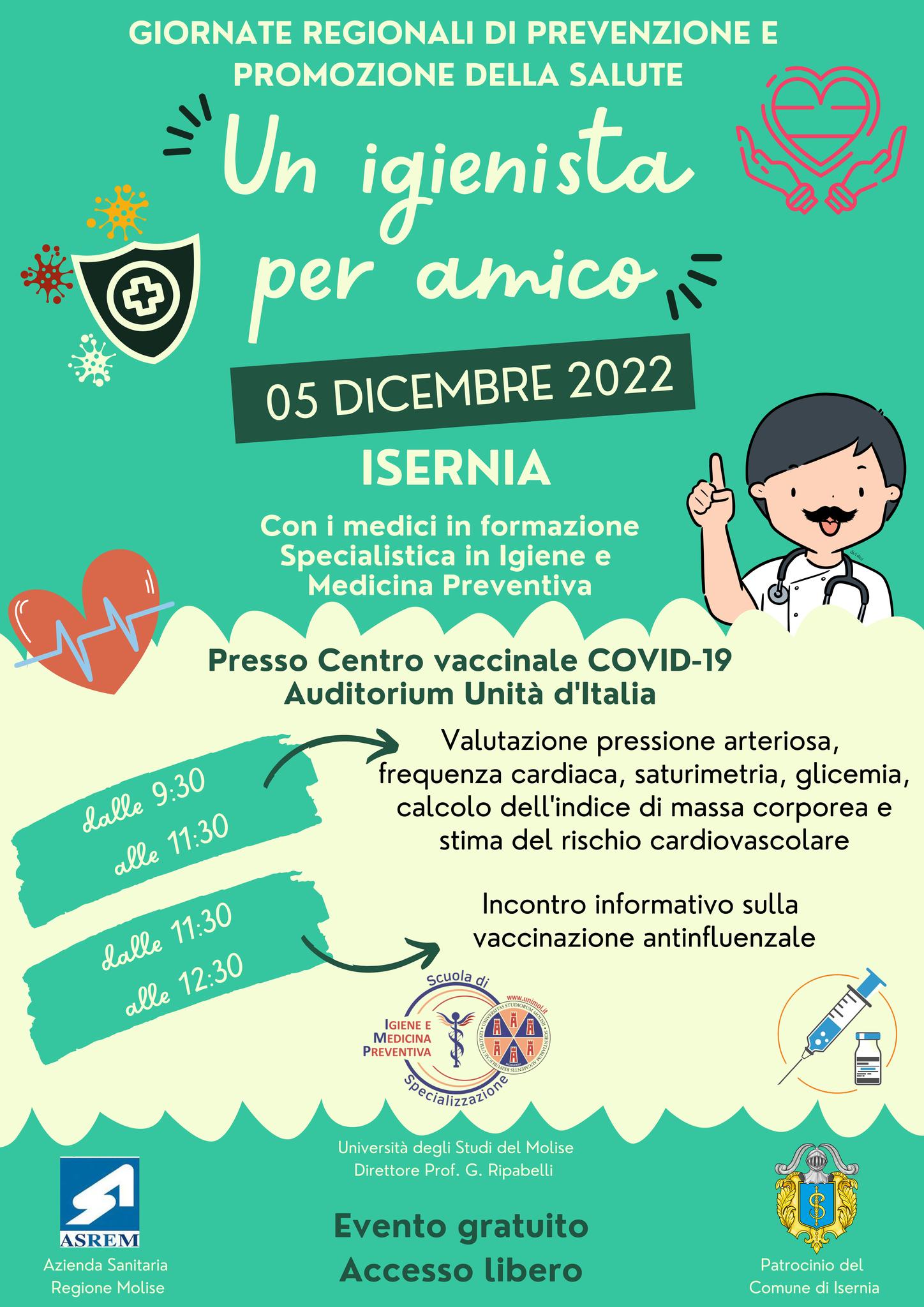 Il prossimo 5 dicembre, con inizio alle ore 9:30, si terrà, presso il Centro vaccinale Covid dell’auditorium Unità d’Italia, la «Giornata regionale di prevenzione e promozione della salute», a cura dell’Asrem e dell’Unimol, con il patrocinio del Comune di Isernia.